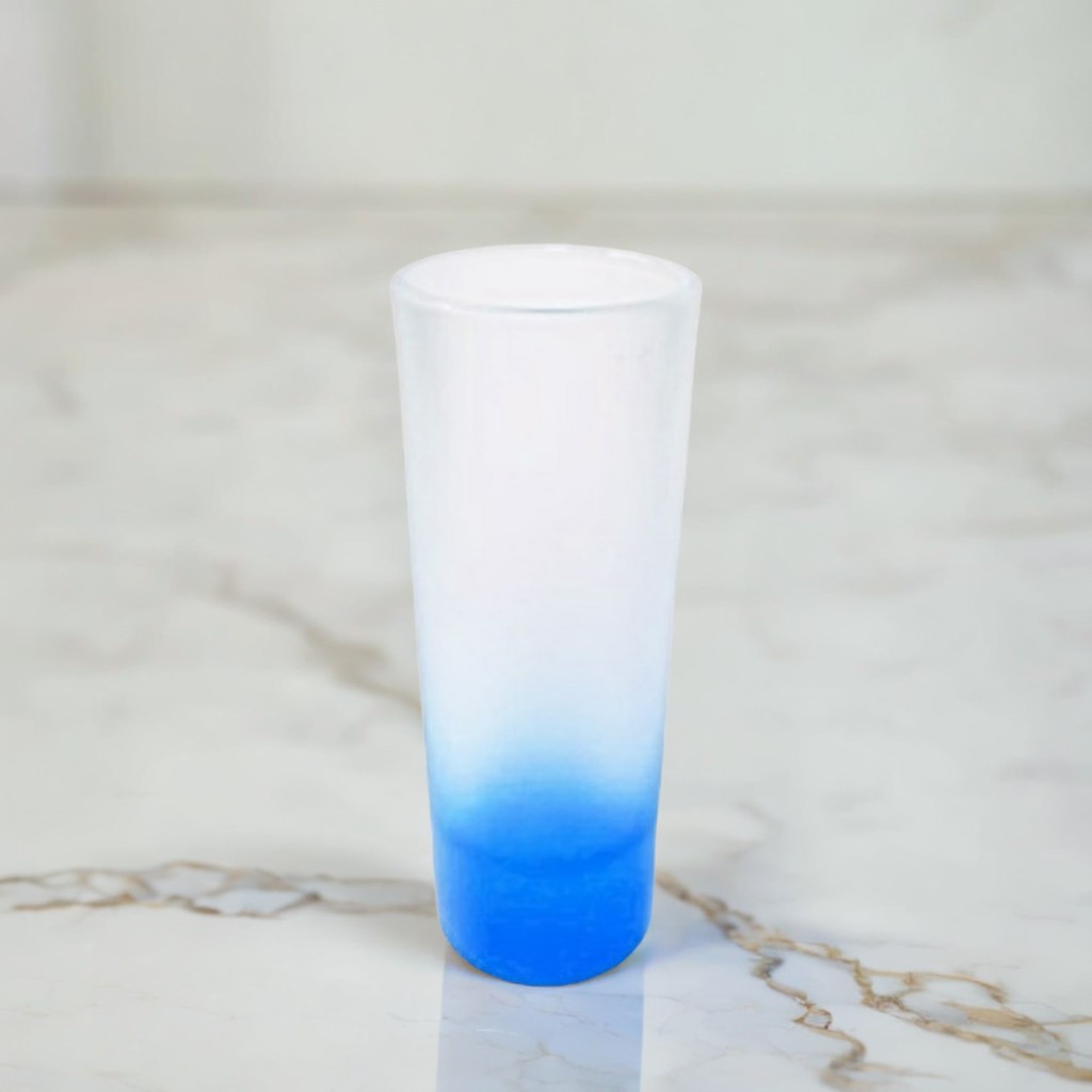 Tequilero satinado con fondo de color azul, listo para sublimar. Ideal para todo tipo de evento.